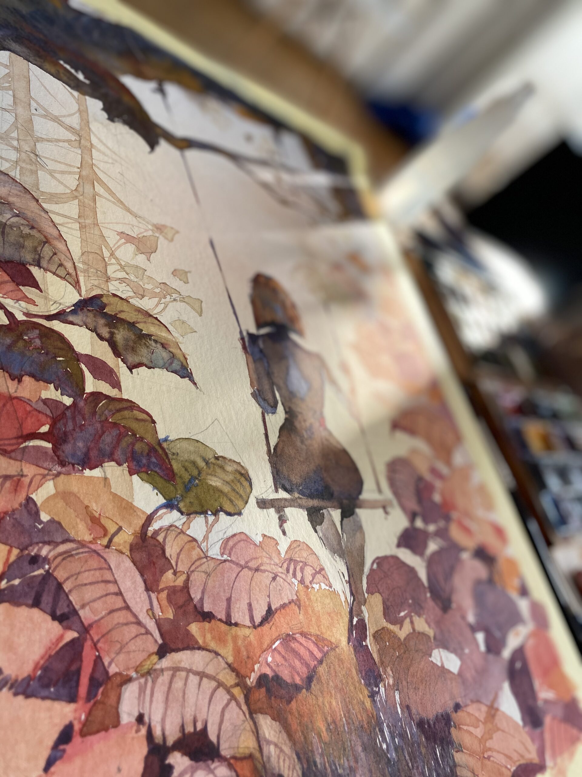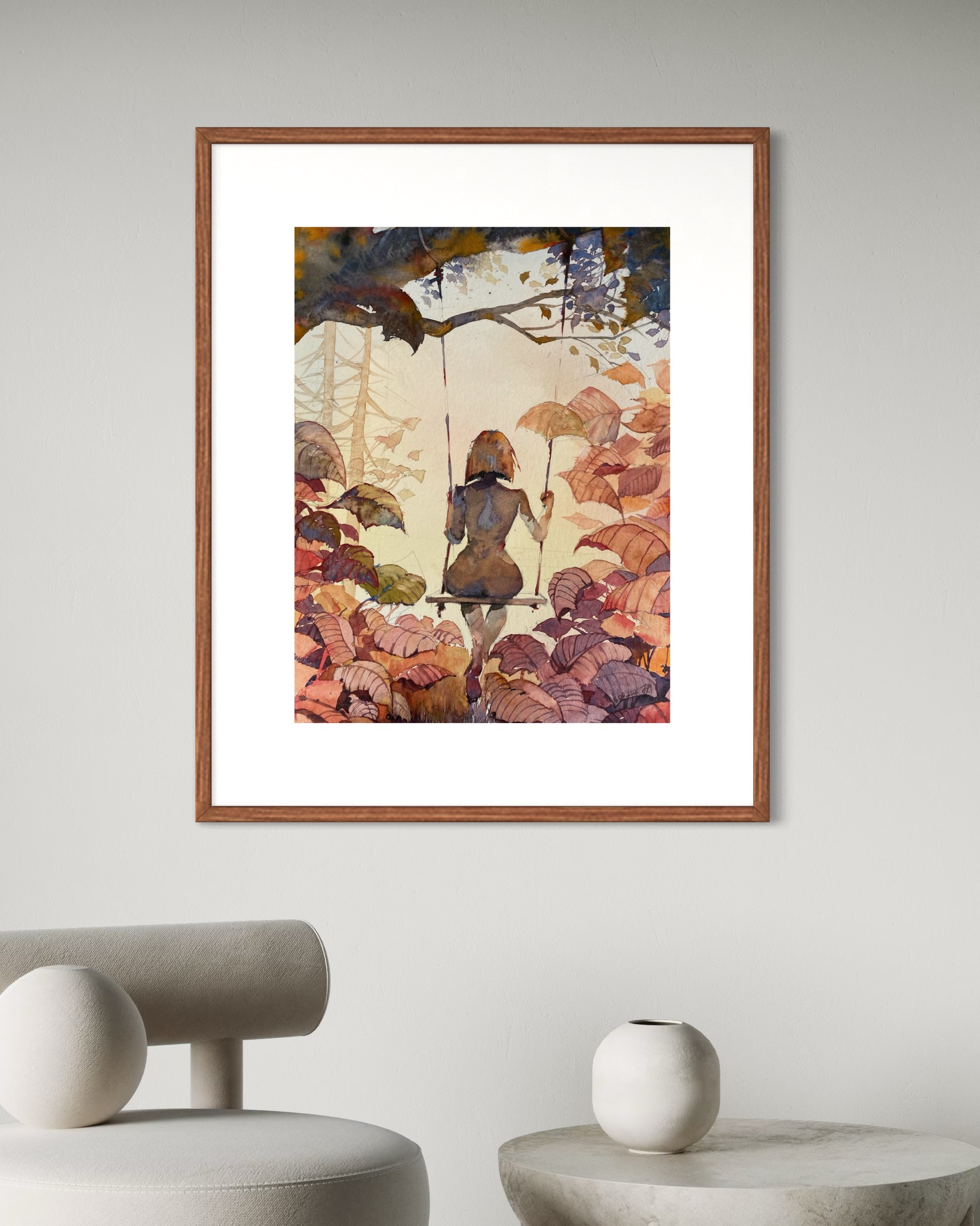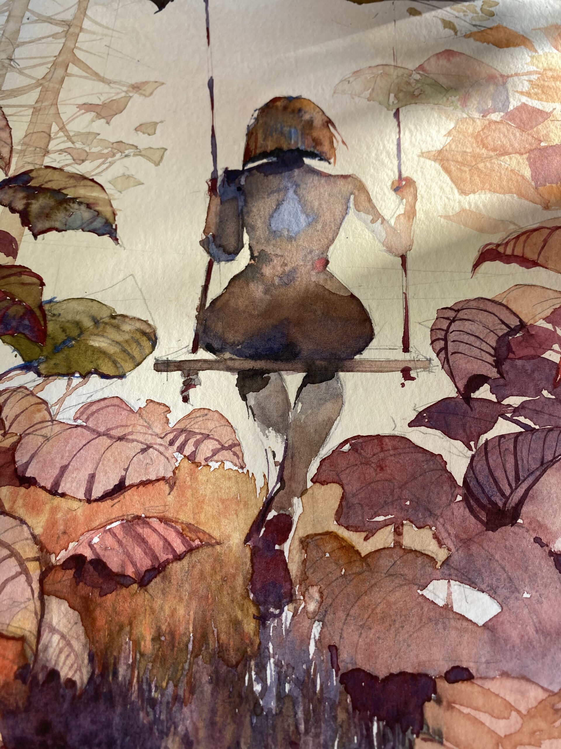 W prezentowanej pracy podjąłem temat zawieszenia między czasem a przestrzenią, ukazując kobiecą postać na huśtawce, odwróconą od widza, zagubioną w kontemplacji natury i samej siebie. Kompozycja rozgrywa się w zgaszonej palecie rudości, fiołków i ochry, zbudowanej z mistrzowską precyzją techniki akwarelowej – techniki znanej z trudności, ale i subtelności wyrazu. Delikatne przejścia tonalne oraz organiczna struktura roślinności tworzą atmosferę ciszy, melancholii i intymnego skupienia. Pomimo narracyjnego potencjału, scena nie jest anegdotyczna – raczej symboliczna, otwarta na interpretację. Przestrzeń obrazu staje się miejscem zawieszenia – między dzieciństwem a dojrzałością, między ruchem a bezruchem, między jawą a snem. Praca doskonale rezonuje z wrażliwością współczesnych kolekcjonerów zainteresowanych introspektywnym podejściem do figuracji i nowoczesną reinterpretacją klasycznych motywów. Obraz wyróżnia się nie tylko walorami formalnymi, ale również zdolnością budowania głębokiego nastroju przy użyciu ograniczonych środków. Polecany do kolekcji prywatnych skoncentrowanych na współczesnej akwareli, figuracji symbolicznej oraz poetyce codzienności.